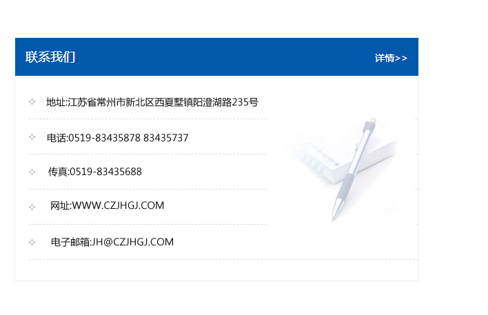 地址:常州市新北區友邦商務大廈1幢16、17層  電話:0519-85101652  傳真:0519-85112595  郵編:213022  網址:www.cz-jiayue_cn.0451zc.com  郵箱:xiajifengaa@163.com